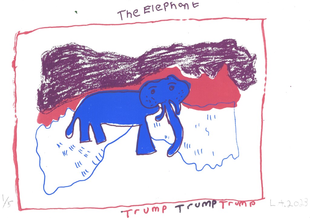 Aquilina recently created a collection of limited edition screen prints and merchandise featuring her illustration of a solo endangered elephant ‘Trump, Trump, Trump’.
