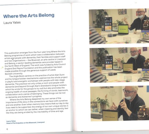 Belong residents enjoyed sculpture, storytelling, dance, music, arts & crafts, digital and sound arts in a series of workshops and sessions led by each of the artists. Each artist was selected by the Bluecoat for their practice and its relationship with ageing, storytelling, movement and sensory experience.