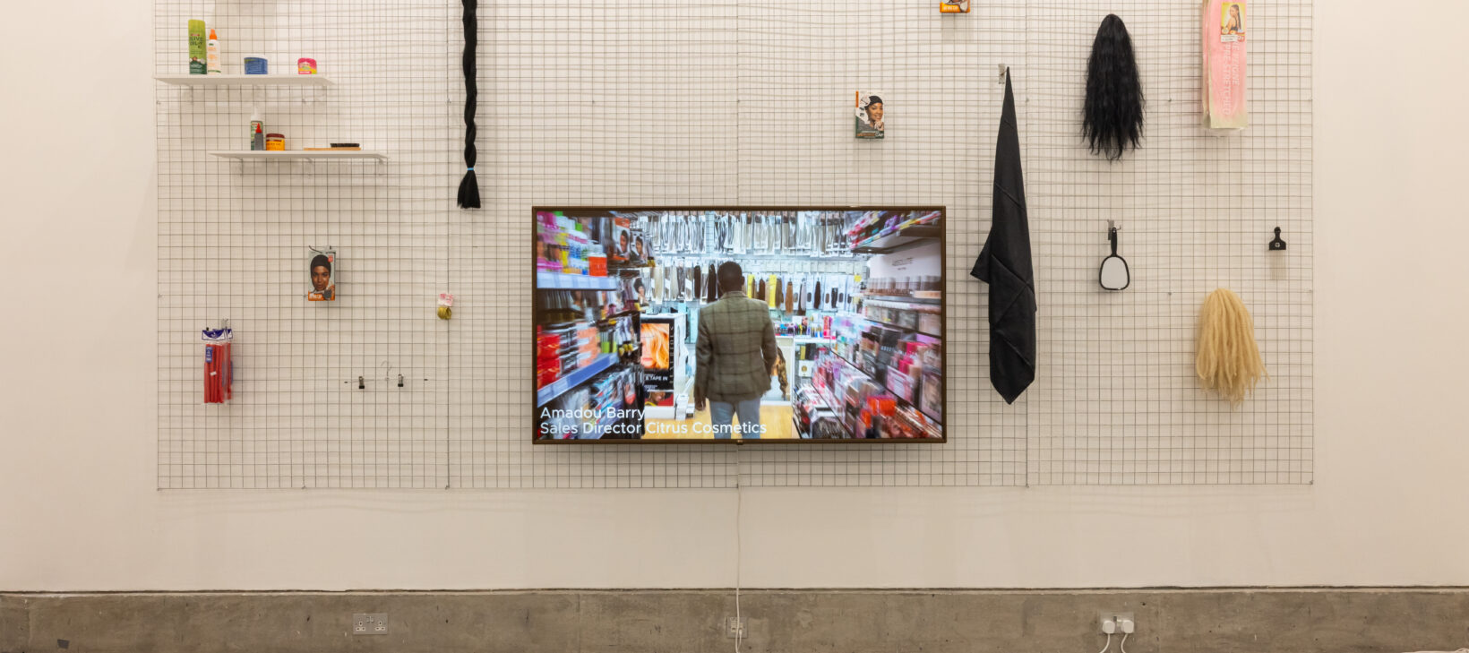The film portrays the hair salon as a culturally important space, somewhere that can offer a meaningful experience in a similar way to what a gallery or museum can. Alongside the film, the installation includes objects and materials that you’d find in a typical hair salon, including mirrors, hair extensions, hair sprays, and more.