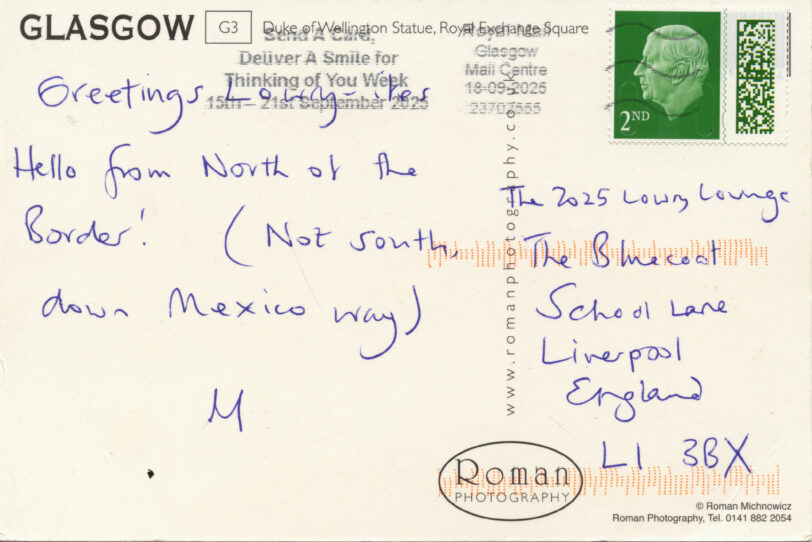 In the Summer, Lowry scholars and fans unable to attend the 2025 event in person, were invited to send postcards, ideally while on holiday. These, sent from Brazil, England, Canada, Scotland, Spain and Wales, were displayed at the Lounge and their messages read out.