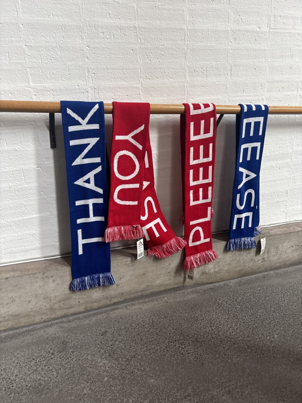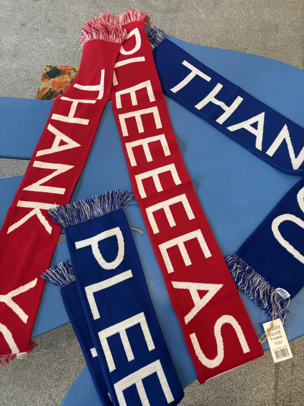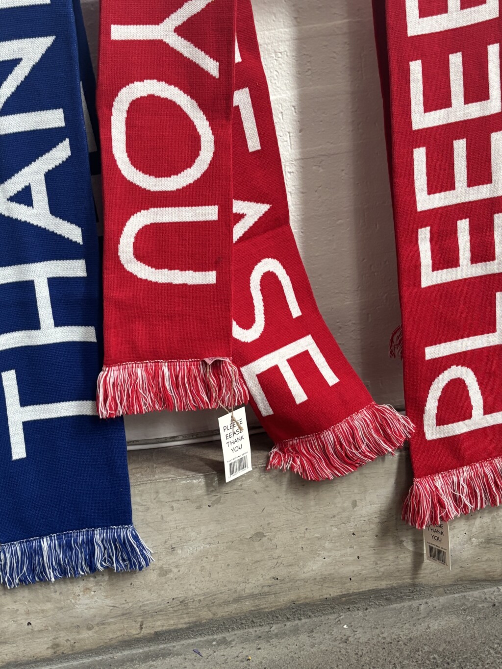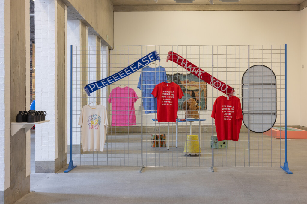 David Shrigley is an artist best known for his distinctive drawing style and works that make satirical comments on everyday situations and human interactions. His 'Please & Thank You' scarves are on display in the exhibition and will be available to purchase.