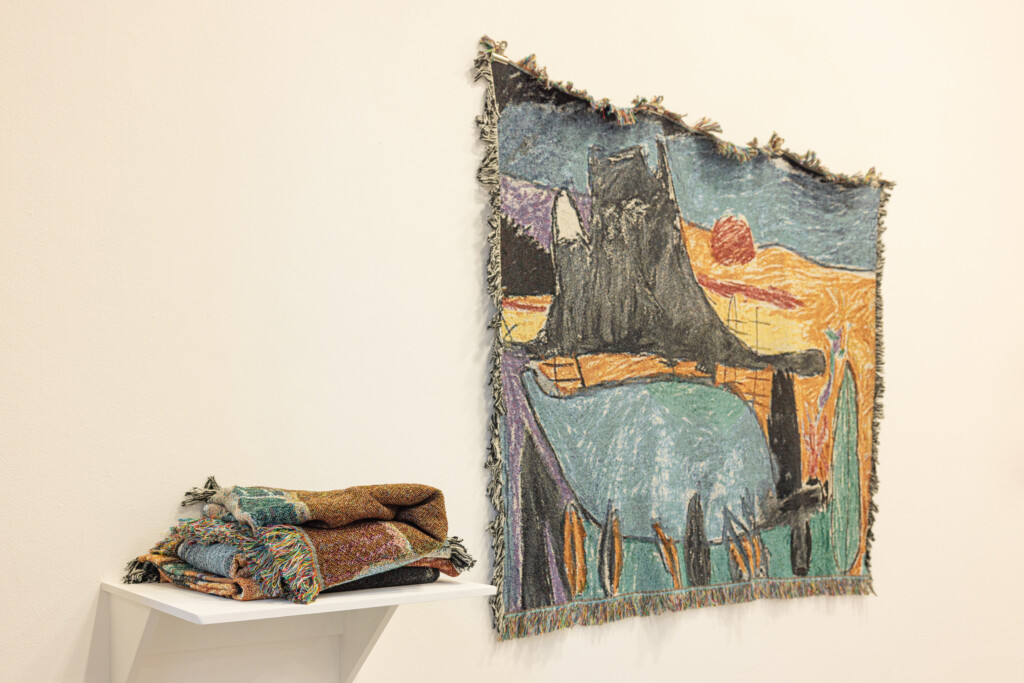 Laura Aquilina’s painting 'The Black Hills of Dakota (2024)' has been turned into a large tapestry blanket, which is now on display in the gallery for visitors to interact with and purchase. The work was inspired by the song of the same name sung by Doris Day in the film 'Calamity Jane'. Aquilina's painting explores Day's character's love for the rocky mountain range in South Dakota, where the film is set.