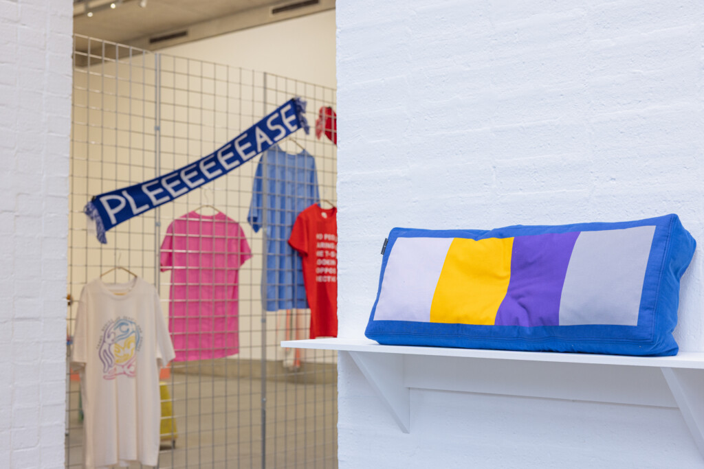 Garth Gratrix draws on coastal culture in his installation Shy Girl. The work includes a series of custom made beach towels, with motifs that reference British seaside towns, working-class culture and LGBTQ identity. Shy Girl proposes browsing as a mode of queer navigation.